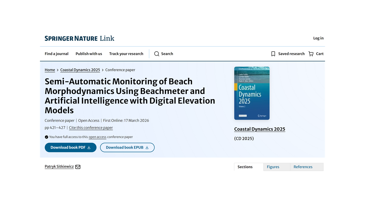 Sitkiewicz P., 2026, Semi-automatic monitoring of beach morphodynamics using Beachmeter and artificial intelligence with digital elevation models, in: Coastal Research Library. Springer Nature Switzerland, Cham, pp. 421–427. https://doi.org/10.1007/978-3-032-15477-4_64 LINK
