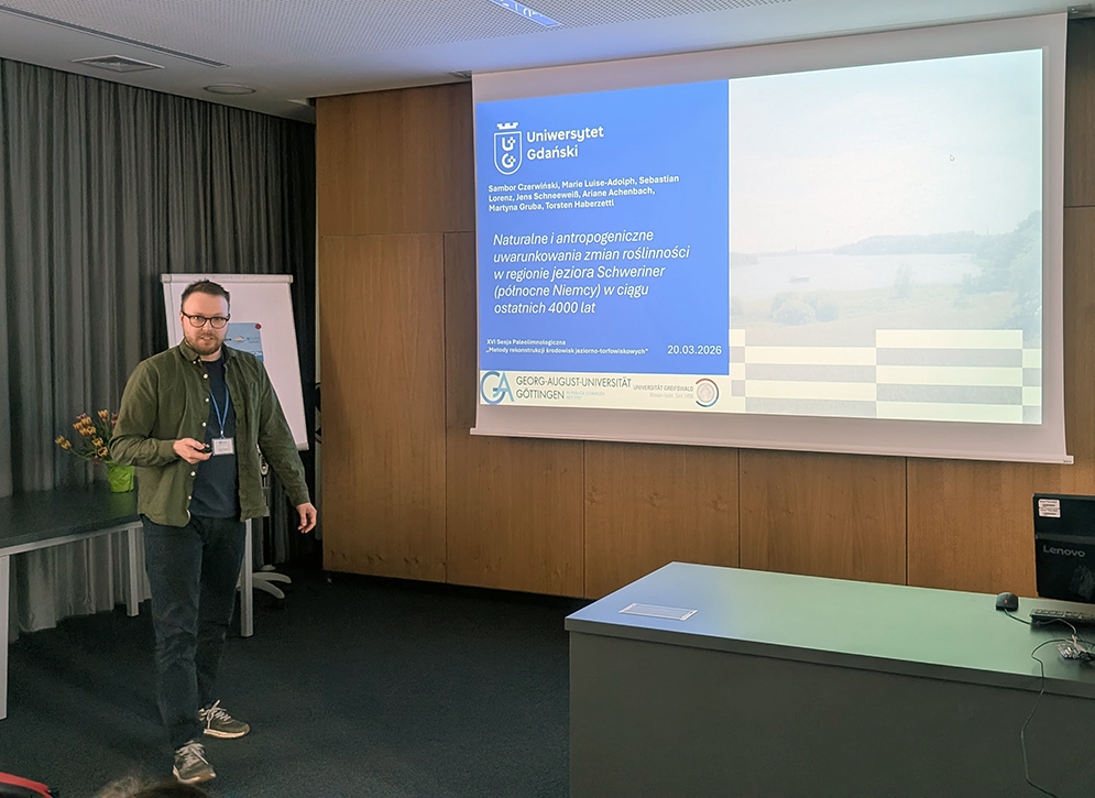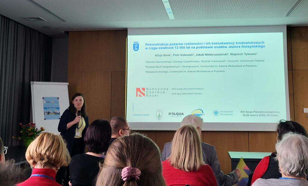 On 19–20 March 2026, the annual gathering of Polish paleolimnologists took place at the University of Wrocław. The 16th Paleolimnological Session “Methods of Reconstruction of Lake and Peatland Environments” (pol. XVI Sesja Paleolimnologiczna „Metody rekonstrukcji środowisk jeziorno-torfowiskowych”) brought together an exceptionally large group of enthusiasts studying past environments through lake and peatland sediment records. A sizable team made the journey from Gdańsk to Wrocław – six of us in total, each presenting at least once.